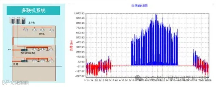 空调系统原为多联机,且大部分已使用十几年,塔楼部分无新风,层高较低。改造时充分考虑利旧,保留少部分能效较高的室外机,其余更换一级能效的多联机。同时,增设带热回收的新风系统,提升室内舒适度。