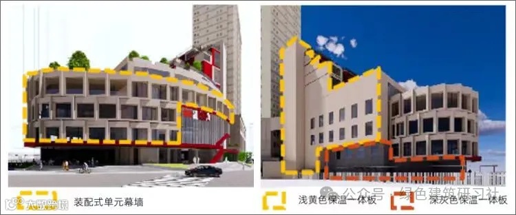 现状为石材和面砖外墙,无保温,窗户较小且为单玻塑钢窗。改造后,整体扩大了窗墙比,沿街西北向主立面改造为装配式单元幕墙,采用岩棉板外保温,并且结合立面造型的巧妙设计了建筑外遮阳,降低西晒的影响;对建筑热桥进行精细化设计,打造了近无热桥的外围护结构设计,东南向非主要功能房间区域采用保温装饰一体板。