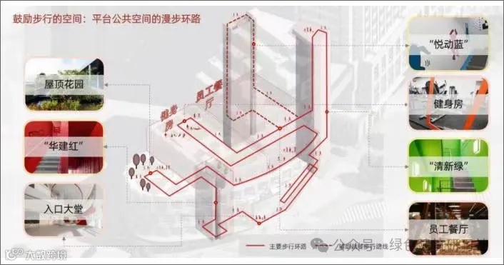 结合内装设计,对室内空间进行健康优化,如采用透明玻璃隔断提升室内自然采光,楼内设置展厅、咖啡厅、休息空间等,增加对员工的人文关怀。通过对现有使用率不高的楼梯间进行艺术氛围的改造,引导员工步行替代乘电梯,并串联健身房、餐厅、屋顶花园等形成漫步环路,鼓励员工健康生活。室外设置小型气象站,室内设置空气质量监测系统,让建筑环境可感知。
