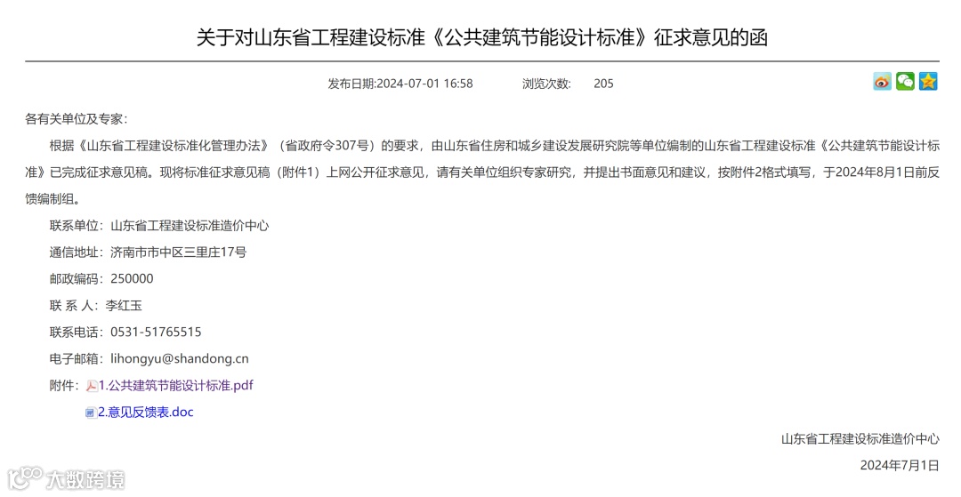 根据《山东省工程建设标准化管理办法》(省政府令307号)的要求,由山东省住房和城乡建设发展研究院等单位编制的山东省工程建设标准《公共建筑节能设计标准》已完成征求意见稿。现将标准征求意见稿(附件1)上网公开征求意见,请有关单位组织专家研究,并提出书面意见和建议,按附件2格式填写,于2024年8月1日前反馈编制组。