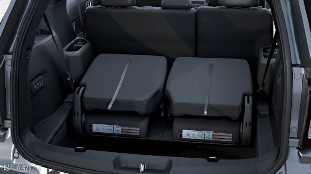 在此模式下再次拉动编号为2的黑色拉环解锁第三排座椅的限位器,然后拖动椅背后方的拉环就能将其向后反转,藏进地板里。与电动模式SWOT状态下一致。