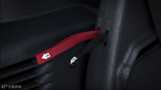 拉住编号为“1”的红色拉环,可以将第三排座椅的靠背向前折叠收起,待靠背完全折叠后再放开拉环。这样就可以形成在电动模式中FOLD按钮执行的更多纵向储物空间的翻折模式。