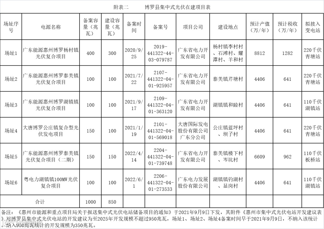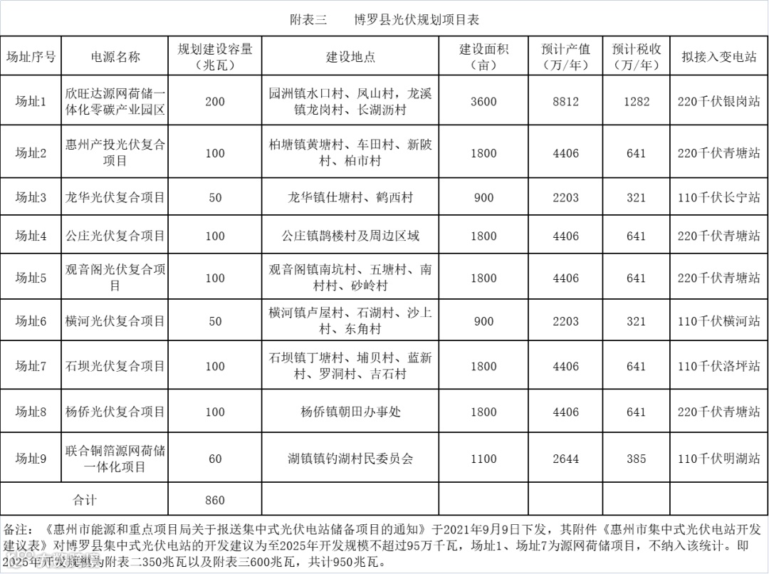 博罗县光伏规划项目表显示,博罗县规划9个光伏项目,规划建设容量860MW。具体名单如下: