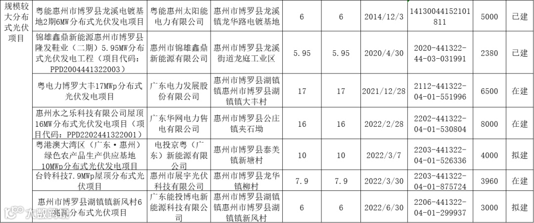 值得注意的是,博罗县集中式光伏在建项目表显示,目前博罗县在建光伏项目6个,备案容量1GW,建设容量850MW。具体名单如下: