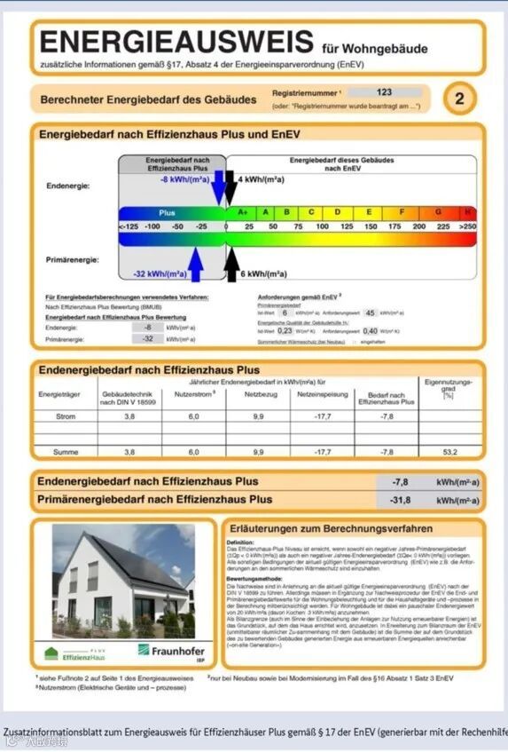 下图是纳入该计划的一栋零能耗小住宅( Effizienzhaus Plus 正能效建筑) 的能效证书,按照上述能耗需求计算方法、应用相关计算软件得出数据:终端能耗:-7.8 kWh/m2a一次能耗:-31.8 kWh/m2a。