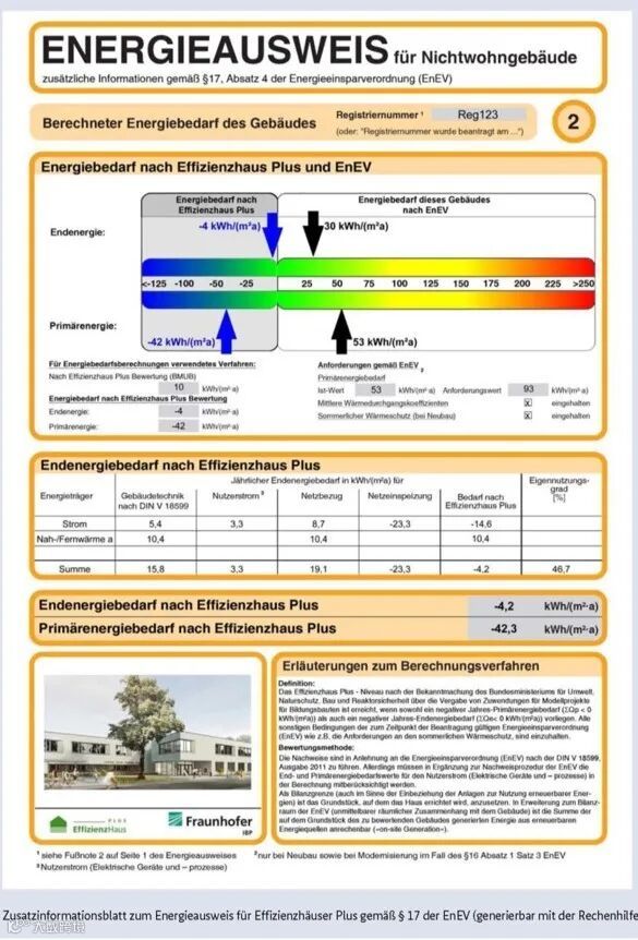 下面这张图是一栋零能耗学校建筑( Effizienzhaus Plus 正能效建筑)的能效证书,按照能耗需求计算方法、应用相关计算软件得出数据:终端能耗:-4.2 kWh/m2a一次能耗:-42.3 kWh/m2a 。