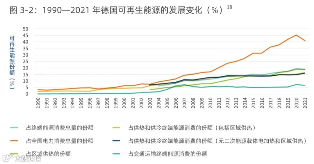 德国是全球能源转型的先驱之一,也是能源结构较好的国家。2021年,德国可再生能源占终端能源消费总量的19.2%,占终端电力消费总量的41.1%(2021年是"小风年"),占区域供热的18.8%,占供热和供冷的16.5%(包括区域供热),占终端交通运输消费总量的6.8%。德国的目标是:在2030年之前实现可再生能源供给满足80%的电力需求和50%的热力需求。