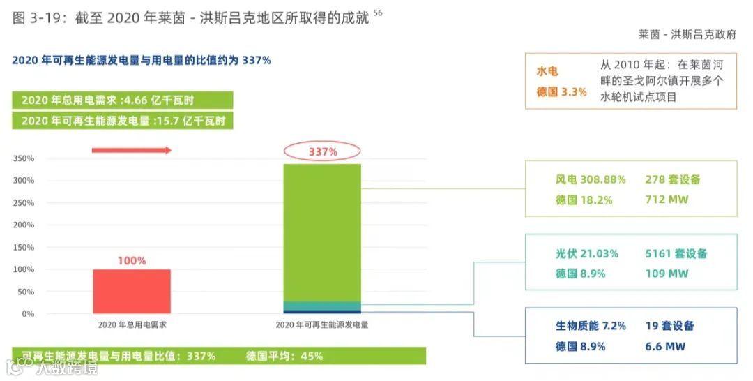 从碳排放平衡表上看,自2015年以来,莱茵-洪斯吕克地区已经实现了气候中和(注:不包括交通运输产生的排放)。25年前,该地区电力需求还必须全部依赖外来输入,而现在当地276台风机生产的电力就足以满足30万户家庭的用电需求。2020年,当地生物质、光伏和风能所生产的电力相当于总需求的337%。根据专家估计,这使莱茵-洪斯吕克成为德国首个在供热、电力和垃圾发电领域实现碳中和的内陆地区。目前,18个公共集体供热网利用森林残留物向家庭住宅供热,在马斯克豪森正在建设一个最大规模的供热网。