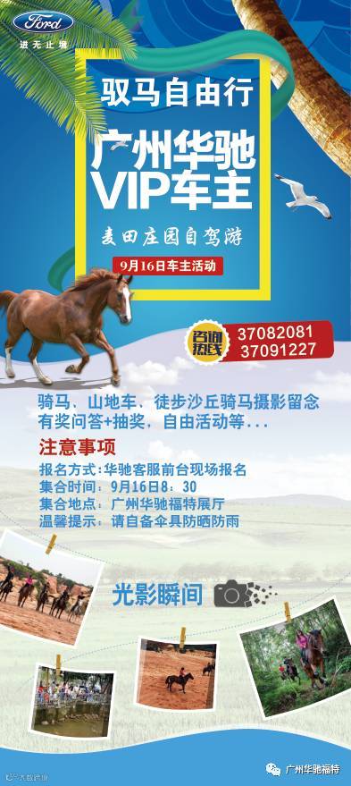 广州华驰福特9.16广州华驰◇驭马 自由行,Vip车主麦田庄园自驾游火热招募中 !诚邀各位车主朋友们一起体验沙丘骑马,山地车,钓鱼等项目。完爆周末好时光。