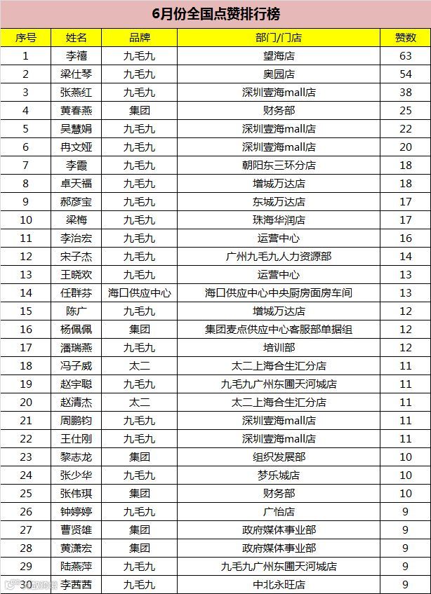 6月份全国点赞排行榜