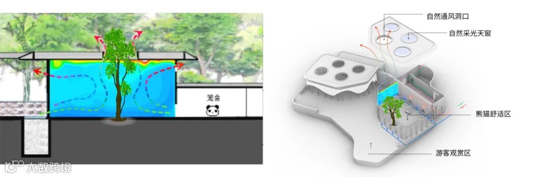 本项目针对大熊猫的热湿环境舒适性要求,创新性地采用了下送上排式的置换式通风气流组织形式,这也是国内外众多大熊猫场馆首次应用的设计案例。