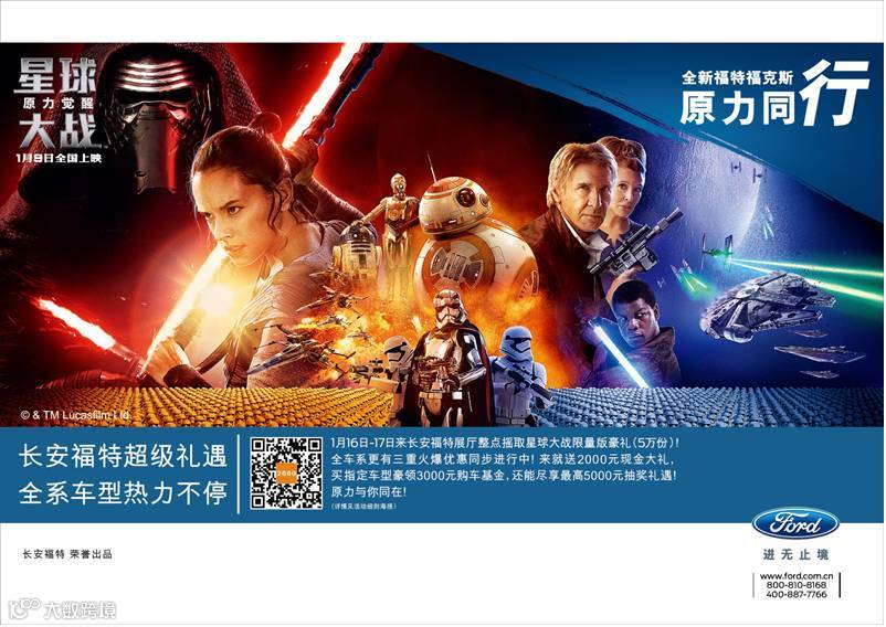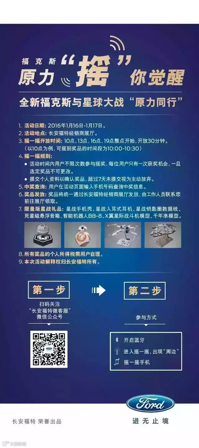 2016年1月9日《星球大战VII:原力觉醒》已在全国上映,全新福克斯举办“星战行动月”活动,广州华驰福特1月16日-17日周末两天购车不打烊,全民手机摇一摇,赢取星战全球限量版礼品!2016年16-17日订车,参与订车三重礼!