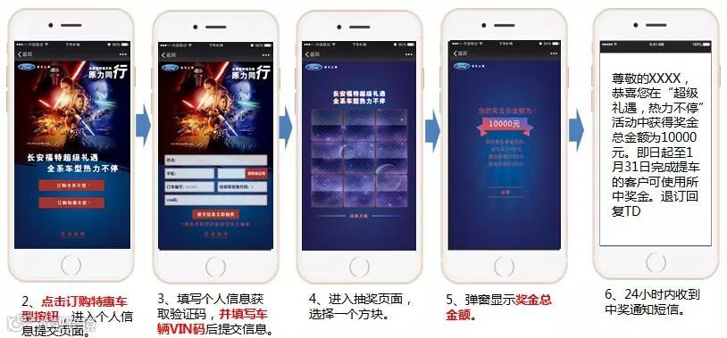 中奖查询:客户通过活动页面,输入手机号码可查询自己的中奖情况;需要提示客户,先关注微信公众号“长安福特微客服”,方便查看中奖记录;
