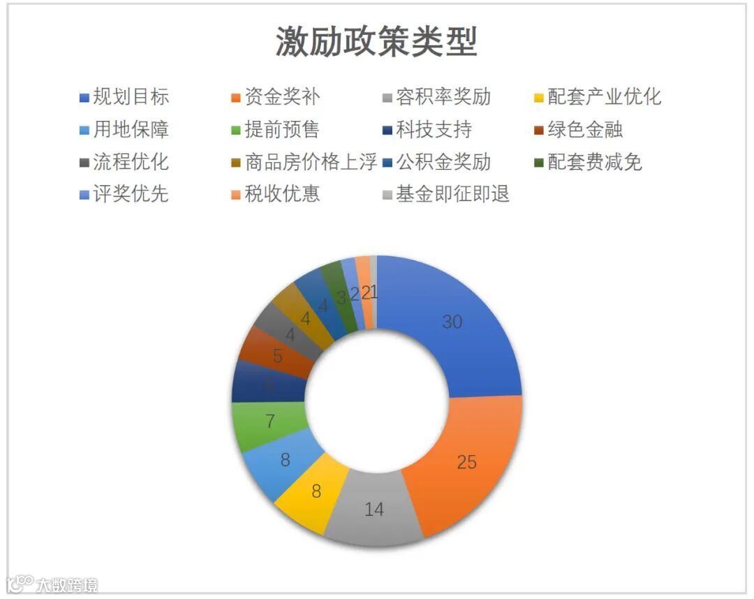 截止2020年6月,各地政策中针对超低能耗建筑项目的激励内容主要分为图中的15 类。可以看到在所有激励方法中,规划目标占比最大,约占全部激励措施种类的29%,接下来是资金奖补和容积率奖励,分别占25%和10%。其余各方法推行数量如图所示,图表对同一地区不同政策文件内激励政策进行了累加。