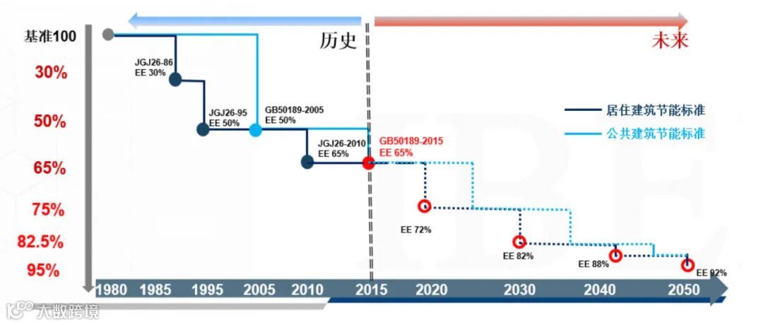 自上世纪80 年代初我国开始组织建筑节能工作,目前已建立覆盖五个气候区、工程建设全过程的节能标准体系。2015年末,我国建筑节能“三步走”的战略完成。严寒和寒冷地区居住建筑节能设计达到相对于上世纪80年代建筑节能 65%的水平,全国范围公共建筑节能设计达到相对于上世纪 80年代65%的水平。