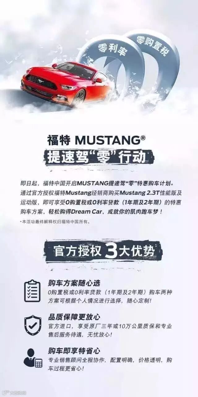 即日起,福特中国开启MUSTANG提速驾“零”特惠购车计划。通官方授权经销商广州华驰福特全国Mustang第一店购买Mustang2.3T性能版以及运动版,即可享受0购置税或0利率贷款(1年期及2年期)的特惠购车方案,轻松购得Dream Car,成就你的肌肉跑车梦!