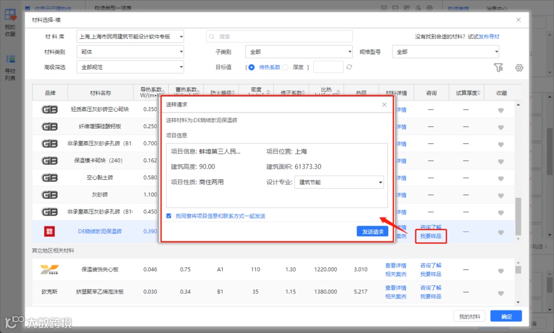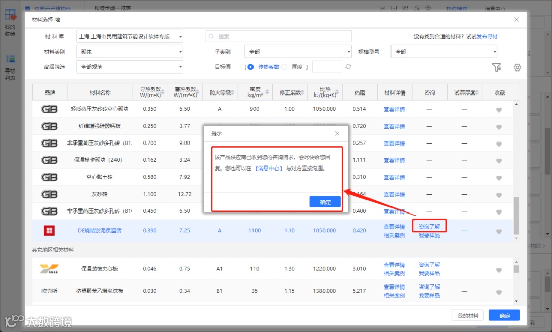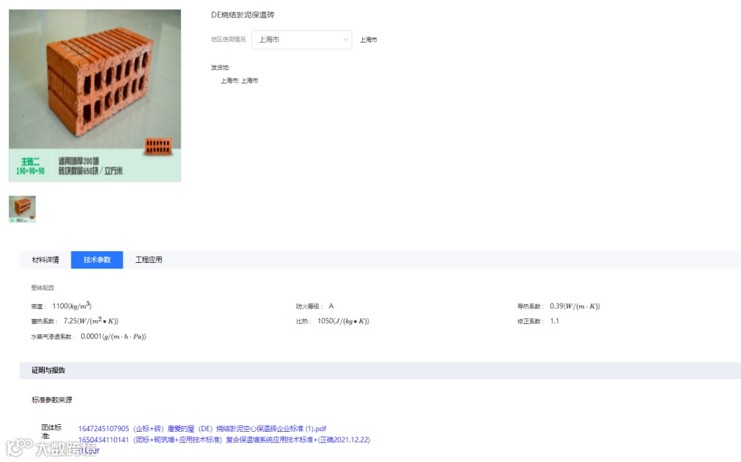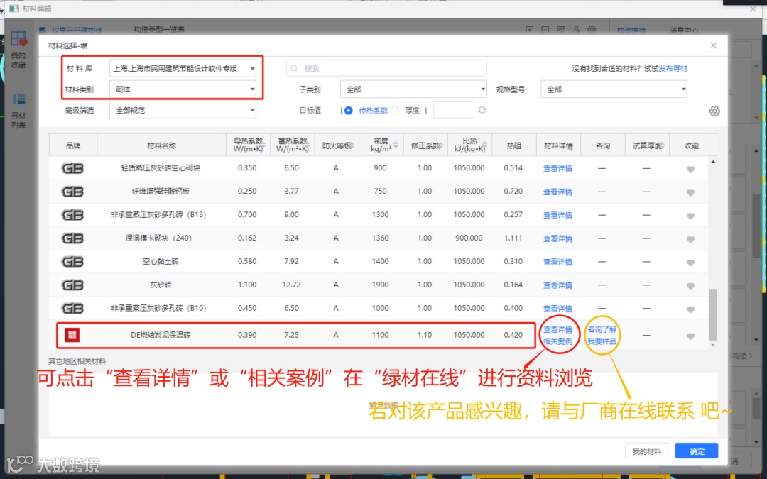 若想查看每一层材料(例如:本系统中的DE烧结淤泥保温砖)的参数及案例,即可点击该层材料进行查看。材料详情界面可以查看到不同类别下材料的热工参数,也支持传热系数与厚度的试算,界面如下: