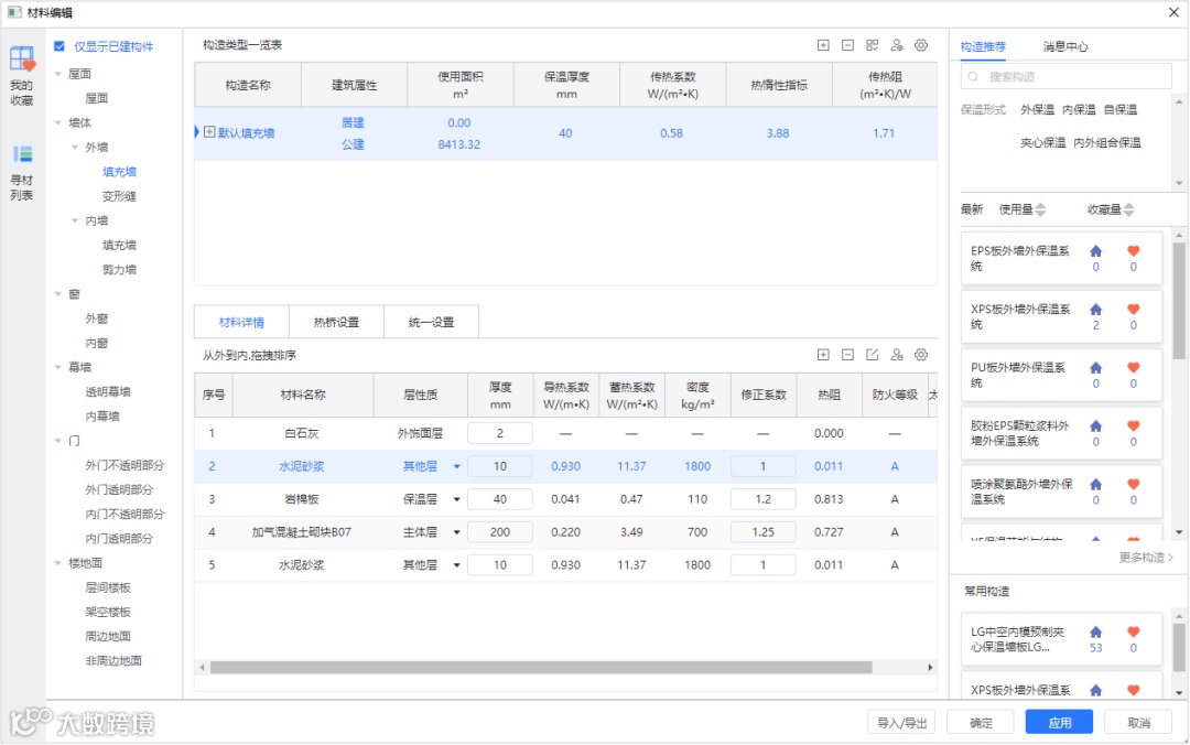 第三步:选用之后可在主页面查看到该构造的每层材料详情及构造传热系数等。