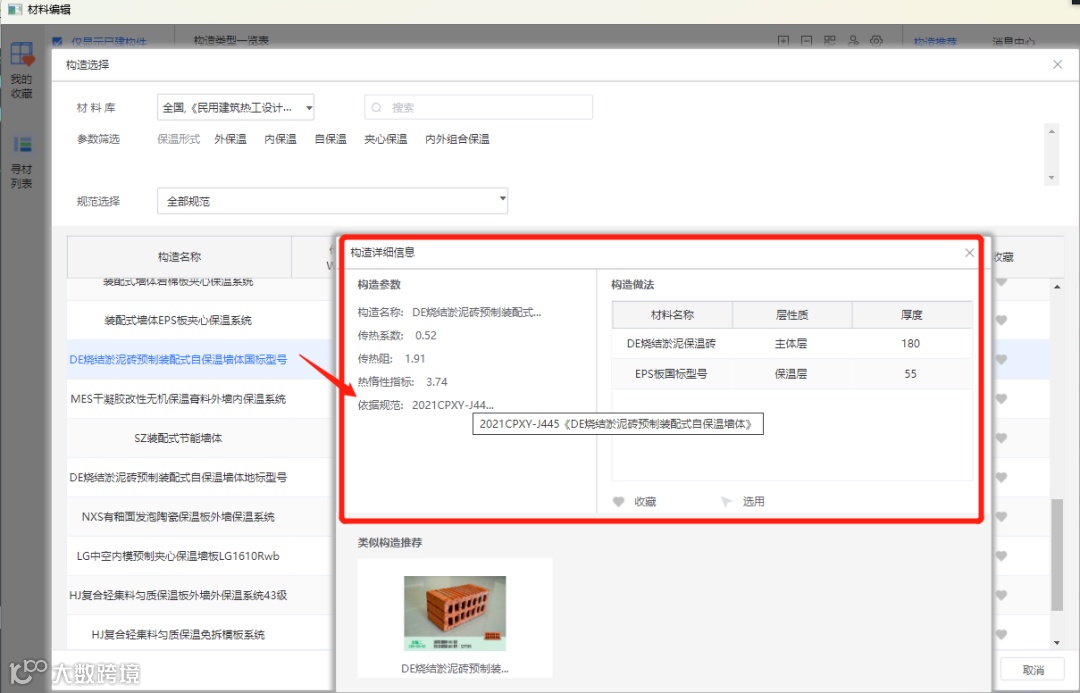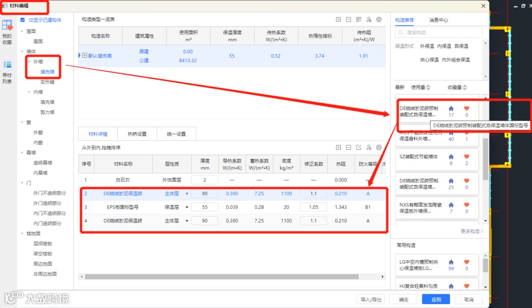 第二步:在右侧的构造推荐可看到被推送出来的“预制DE烧结淤泥砖复合自保温墙体”,可双击进行选用。