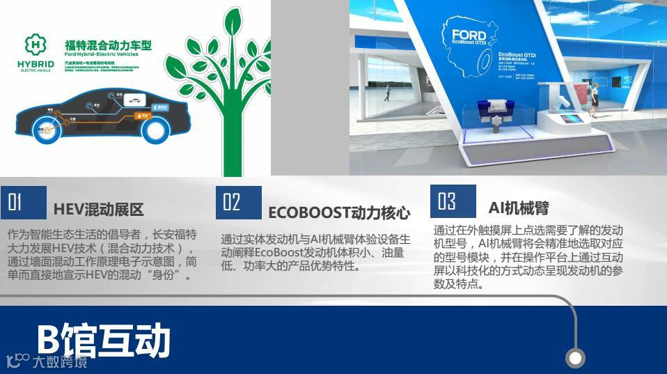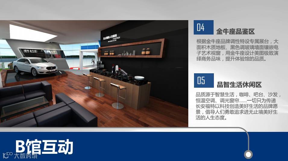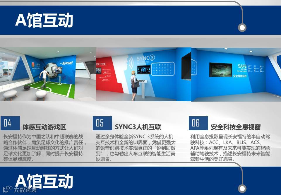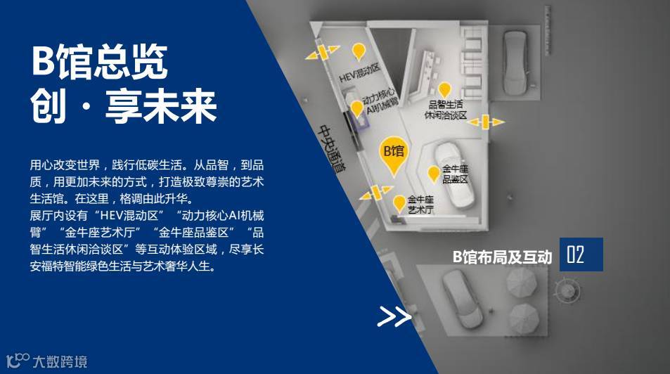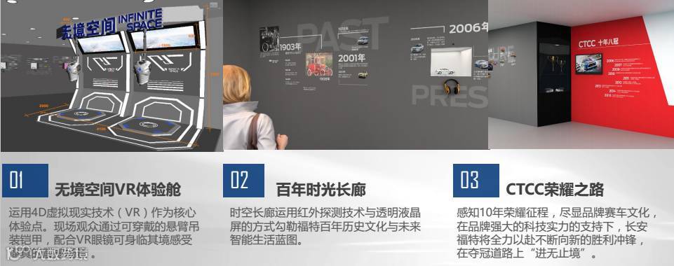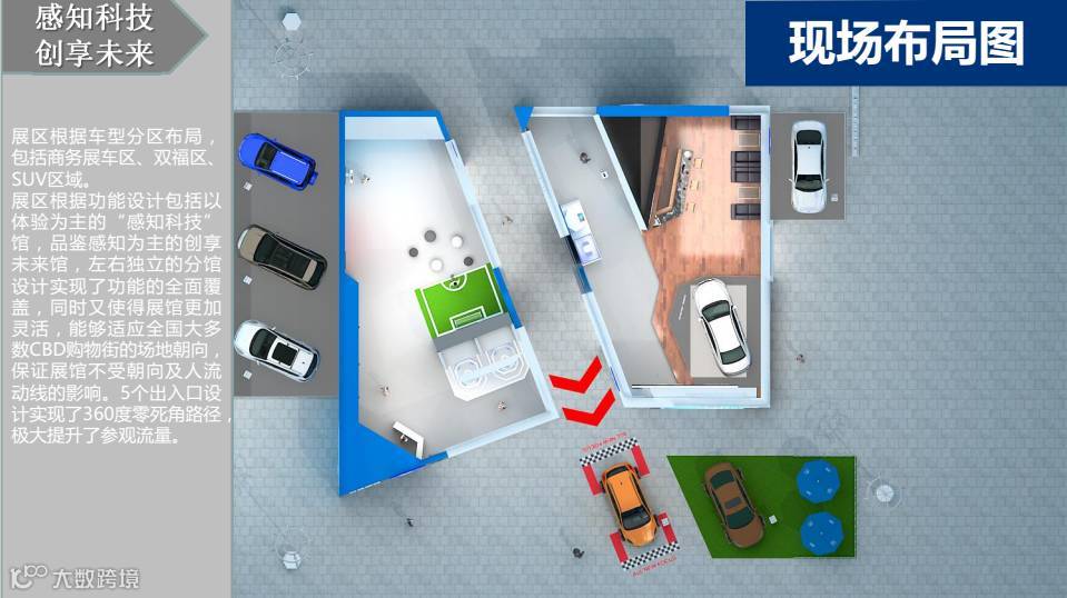展区根据车型分区布局,包括商务区、双福区、SUV展区,展区根据功能设计包括以体验为主的“感知科技”馆,品鉴感知为主的创享未来馆,左右独立的分馆设计实现了功能的全面覆盖。