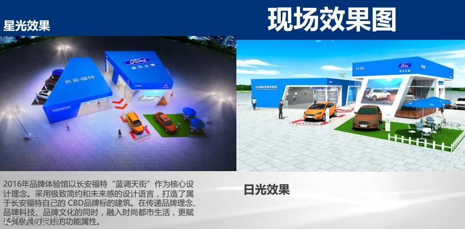 2016年品牌体验馆以长安福特“蓝调天街”作为核心设计理念。采用极简约和未来感的设计语言,打造了属于长安福特自己的CBD品牌标的建筑。在传递品牌科技、品牌文化的同时,融入时尚都市生活,更赋予其极具时代感的功能属性。