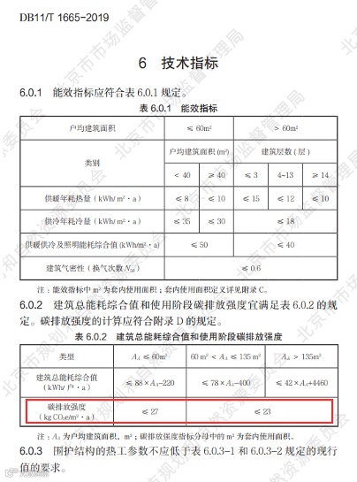《北京市超低能耗居住建筑节能设计标准》对不同类型建筑的总能耗综合值及碳排放强度提出限额要求。