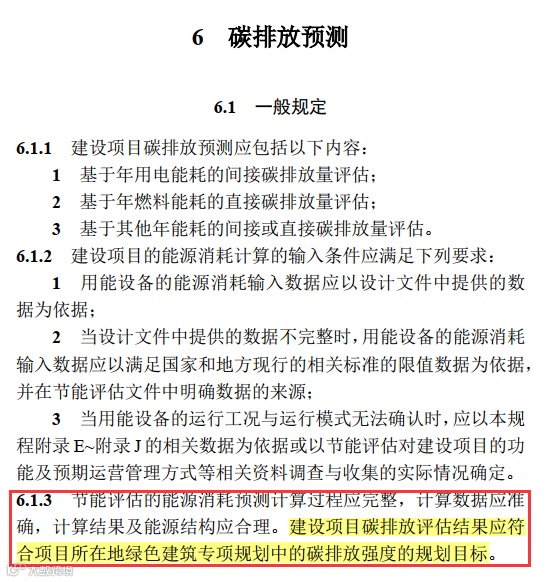 浙江省节能评估应对建设项目的预期运行进行建筑碳排放预测,建设项目实施后的预期运行碳排放不应超过项目所在地绿色建筑专项规划中的碳排放强度的规划目标。