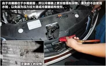 冷凝器是散热装置,承担了整个系统向外散热的任务,将压缩机压缩过程中产生的大部热量发散到车外空间中,使压缩机出来的高温高压气体变为中温高压液体。冷凝器的好坏直接影响空调的制冷性能。冷凝风扇是吸风式的,灰尘、泥土、沙子都对它产生不利影响,时间一长,冷凝器表面就蒙了一层泥外罩,降低换热系数,使散热不良。车主们要检查冷凝器与水箱之间的灰尘是否过多,用高压气彻底清洗,保证水箱和冷凝器有良好的散热性能。