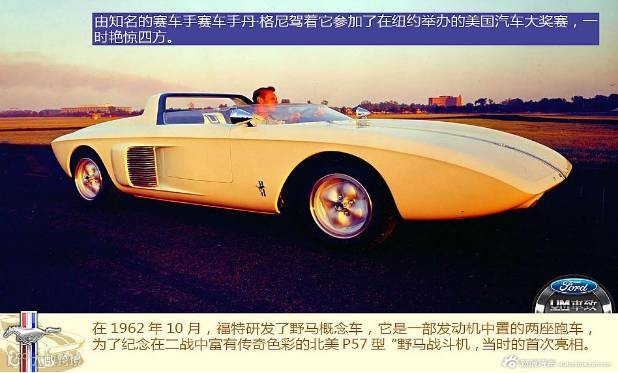 1962年,福特研发了Mustang的第一辆概念车——Mustang I概念车。它是一部发动机中置的两座跑车。而Mustang的名称正是为了纪念二战中富有传奇色彩的美军P-51型Mustang战斗机。