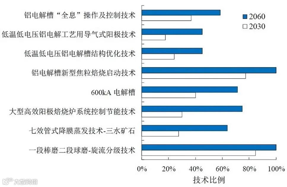 上述碳排放路径对应的重点技术发展路径如图10所示。在氧化铝精炼环节,应大力推广一段棒磨二段球磨-旋流分级技术和强化溶出技术,2060年实现100%普及,此外,多效管式降膜蒸发技术也应得到广泛推广,尤其是以三水矿石为原料的七效管式降膜蒸发技术,到2060年应推广至64%以上。在阳极制备环节中,先进技术为大型高效阳极焙烧炉系统控制节能技术,此项技术节能效果显著,到2060年,该技术使阳极制备环节节约能源150万吨标准煤,普及率应达到75%。对于大型电解槽,目前主流槽型为300~400千安电解槽,为了提高能效,电解槽的大型化是未来铝冶炼行业长期关注和发展的重点,到2050年,应实现小型电解槽逐渐被淘汰,全部电解槽大于500千安,到2060年600千安槽型推广率争取达到70%以上。在电解铝环节中,到2060年,铝电解槽新型焦粒焙烧启动技术、低温低电压铝电解槽结构优化技术、低温低电压铝电解工艺用导气式阳极技术、铝电解槽“全息”操作及控制技术、预焙铝电解槽电流强化与高效节能综合技术等先进技术预计累计节电约8 000亿千瓦时,这几项技术到2060年的技术普及率应达到100%、45%、45%、58%、43%。除推广上述重点先进技术外,铝冶炼行业应加快发展水电铝合营模式以及再生铝工艺,加快低碳转型进程。