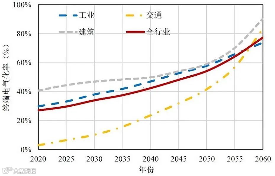 碳中和目标将促使终端电气化进程不断推进,按照国家能源局公布口径,以中需求—高速转型—长平台期情景为例(图6),2030年终端电气化率约为34%,并于2060年达到77%以上。分部门来看,建筑部门设备的电气化推进易于其他部门,因而其电气化水平整体高于其他部门,2020—2060年间年均电气化增长率为2%, 2060年建筑部门电气化水平需达到90%。工业部门是耗电量最大的部门,因而其电气化发展水平对终端部门整体的电气化水平影响较大,2060年电气化率需达到73%以上;交通部门2040年前的电气化进程较为缓慢,其电气化推广主要集中于短途客运交通,2040年后城际客运交通和货运交通电气化开始重点发力,带动整体交通部门电气化水平快速增长,并于2060年达到84%。