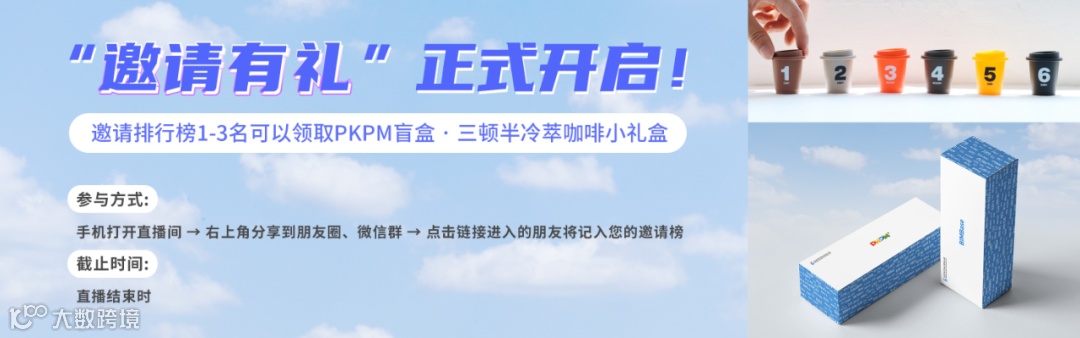 直播间设置“邀请有礼”活动,分享直播间链接,邀请榜排名前3名的观众,将获得PKPM定制冷萃咖啡小礼盒(最终排名以活邀请榜为准)。