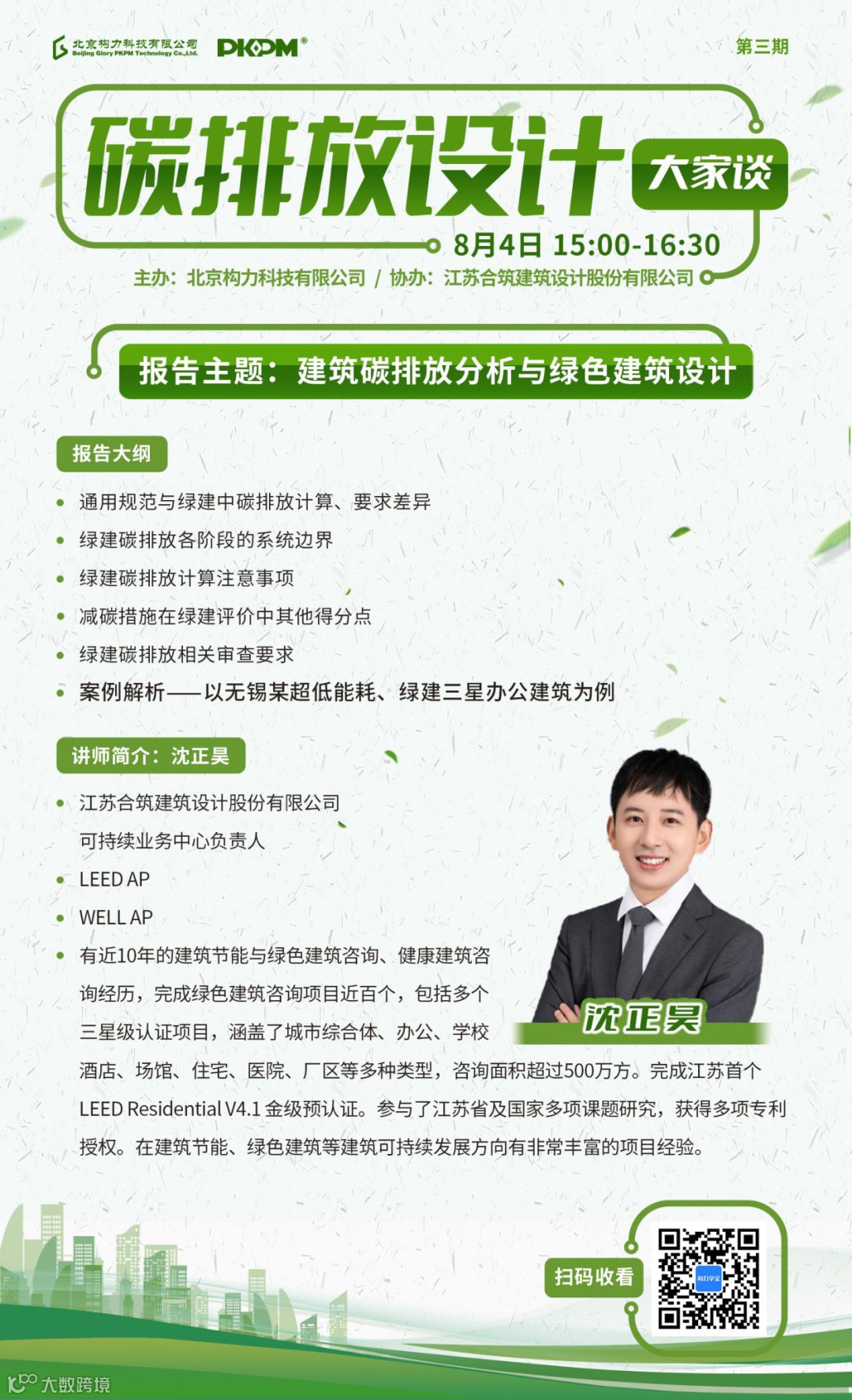 第三期我们有幸邀请到江苏合筑建筑设计股份有限公司可持续业务中心负责人沈正昊带来 《建筑碳排放分析与绿色建筑设计》 ,和大家分享无锡某超低能耗、绿建三星办公建筑案例并对通用规范对碳排放计算要求、碳排放审查要求、减碳措施等相关问题进行介绍。