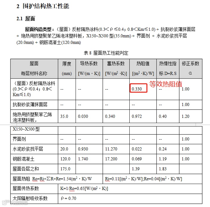 了解建筑反射隔热涂料的参与节能计算的原理之前首先要知道等效热阻的概念,等效热阻建(构)筑物外墙和屋面的外表面使用反射隔热涂料或反射隔热保温涂料时,与相同条件下采用太阳辐射吸收系数为 0.7 的普通涂料相比等效增加的热阻。