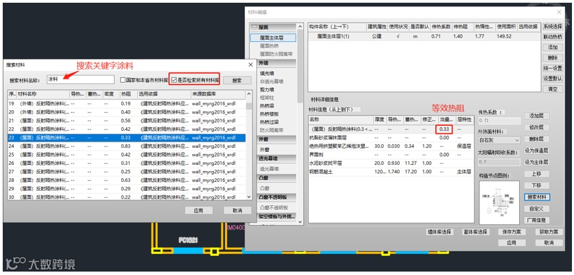 在软件中可通过材料编辑-搜索材料功能快速寻找建筑反射隔热涂料,并用于屋面或外墙。
