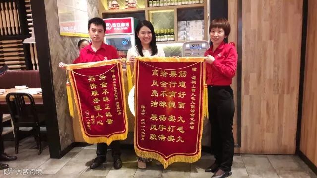 大概过了一小时后,客人打电话到门店咨询,员工也反复跟客人核实基本信息后,让客人亲自过来领取。陈女士当面感谢了拾金不昧的杨宇浩,并在五月四日青年节这天,送来了感谢个人和门店的旗帜。