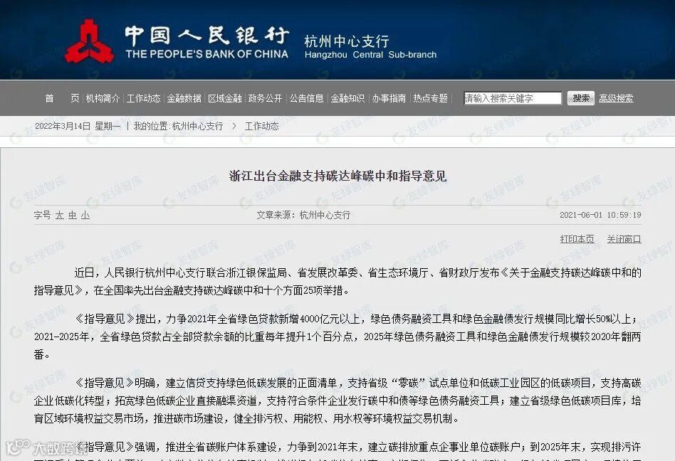 2021年5月,人民银行杭州中心支行联合浙江银保监局、省发展改革委、省生态环境厅、省财政厅发布《关于金融支持碳达峰碳中和的指导意见》,在全国率先出台金融支持碳达峰碳中和十个方面25项举措。《指导意见》明确,建立信贷支持绿色低碳发展的正面清单,支持省级“零碳”试点单位和低碳工业园区的低碳项目,支持高碳企业低碳化转型;拓宽绿色低碳企业直接融资渠道,支持符合条件企业发行碳中和债等绿色债务融资工具。