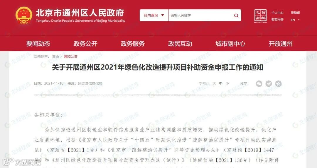 2021年11月10日,北京市通州区发布《通州区绿色化改造提升项目补助资金管理办法(试行)》。绿色化补助资金主要用于对企业参与绿色制造体系建设、绿色化改造项目、开展可再生能源替代项目、减碳发展等方面给予一定的补助支持。