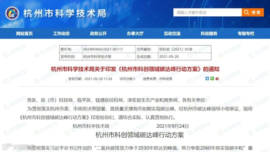 2021年9月28日,杭州市印发《杭州市科创领域碳达峰行动方案 》,行动方案围绕“四个创新”,面向能源、工业、建筑、交通、农业、居民生活等六大领域,构建杭州市绿色低碳技术创新体系。