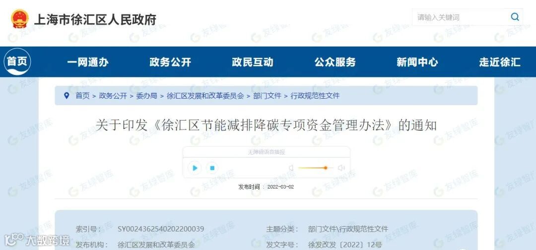 2022年3月2日,《徐汇区节能减排降碳专项资金管理办法》印发。