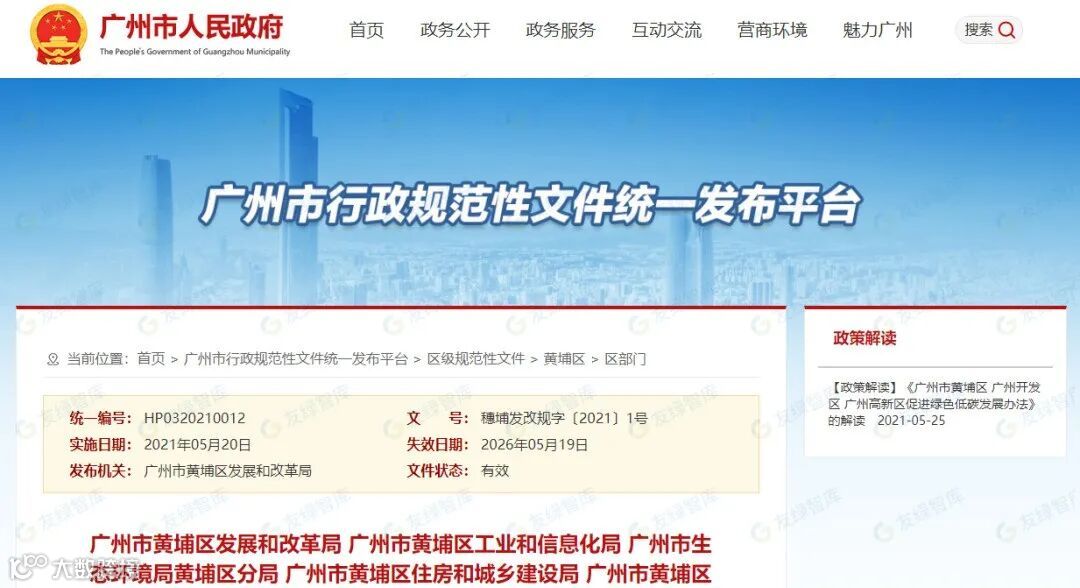 2021年5月20日《广州市黄埔区 广州开发区 广州高新区促进绿色低碳发展办法》印发,进一步放大财政资金的带动作用,文件指出,对纳入监管的重点用能单位实施节能降耗,最高补贴1000万元;对企业实施循环经济和资源综合利用项目的按实际投资总额给予最高200万元补助;对建设充电基础设施项目的给予最高100万元补贴。对在我区举办国际级或国家级新能源绿色产业峰会、重大论坛、创新大赛等活动的给予最高100万元补贴。