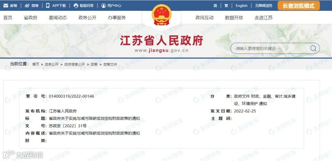 2月25日,江苏省发布《关于实施与减污降碳成效挂钩财政政策的通知》。2021年度起,将各市、县(市)排放的化学需氧量、氨氮、总氮、总磷、氮氧化物、颗粒物、挥发性有机物等7项污染物总量作为考核挂钩标的。将碳排放强度作为调节因子。省财政将依据挂钩标的和调节因子收取污染物排放统筹资金。纳入标的的污染物种类可结合环境变化和政策执行情况作适当调整。