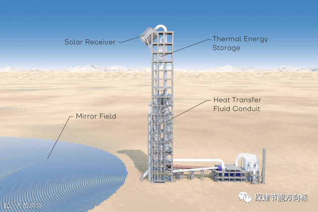 一块镜子将太阳辐射集中在太阳能塔顶部的焦点处,太阳能接收器就位于该处。当阳光普照时,集中的阳光将太阳能接收器内的传热流体 (HTF) 加热到高达 1'500°C。即使在没有阳光的情况下,热能储存也能确保连续的水泥生产。