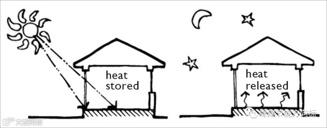 在夜晚寒冷白天炎热的地方,使用具有高热容量的墙壁、地板或屋顶,使白天吸收的热量在晚上释放出来。这样,室内日夜都保持在舒适的温度下。