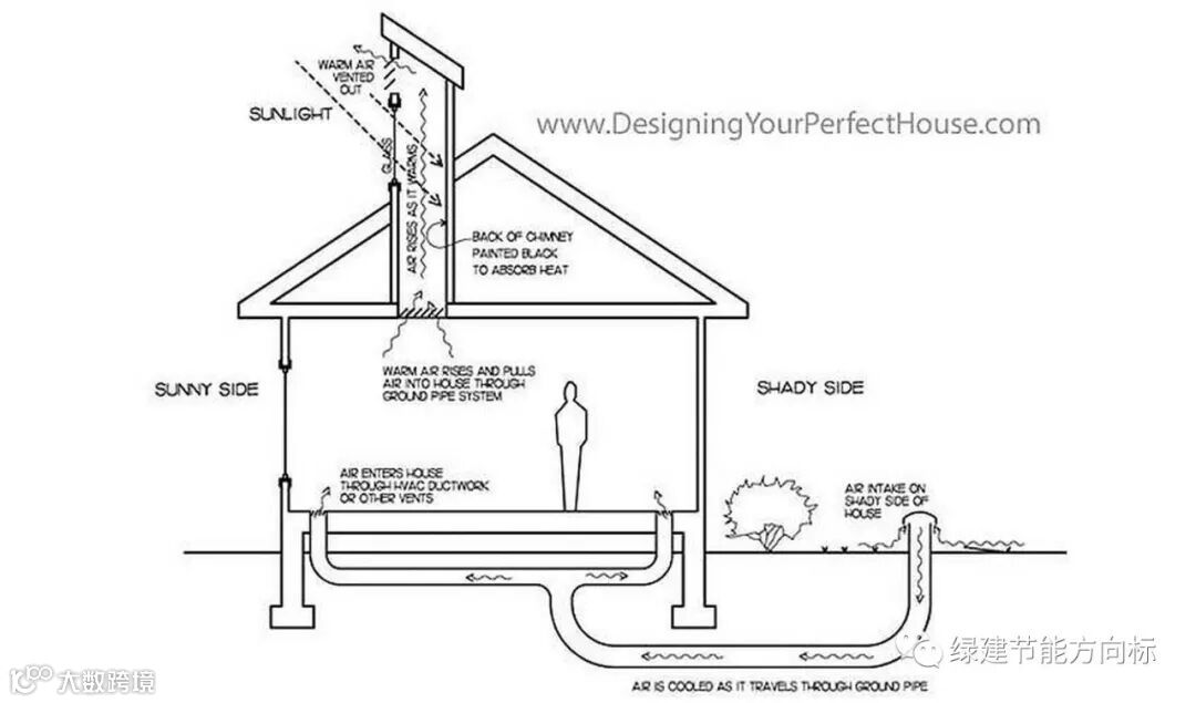 在炎热的夏季,白天和黑夜都需要降温,采用带有夜间通风孔的保温墙。夜间开放系统允许自然通风。