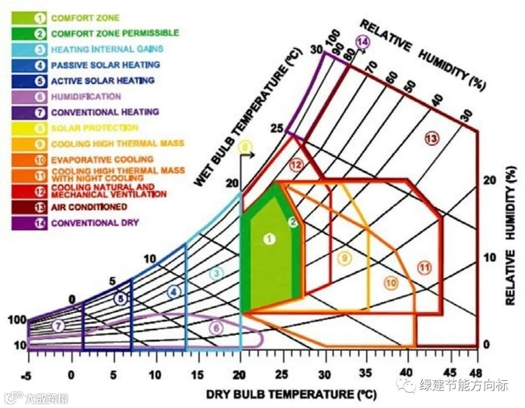 这是国外教授研究出来的温湿度理论,中间的绿色区域是人类居住舒适区