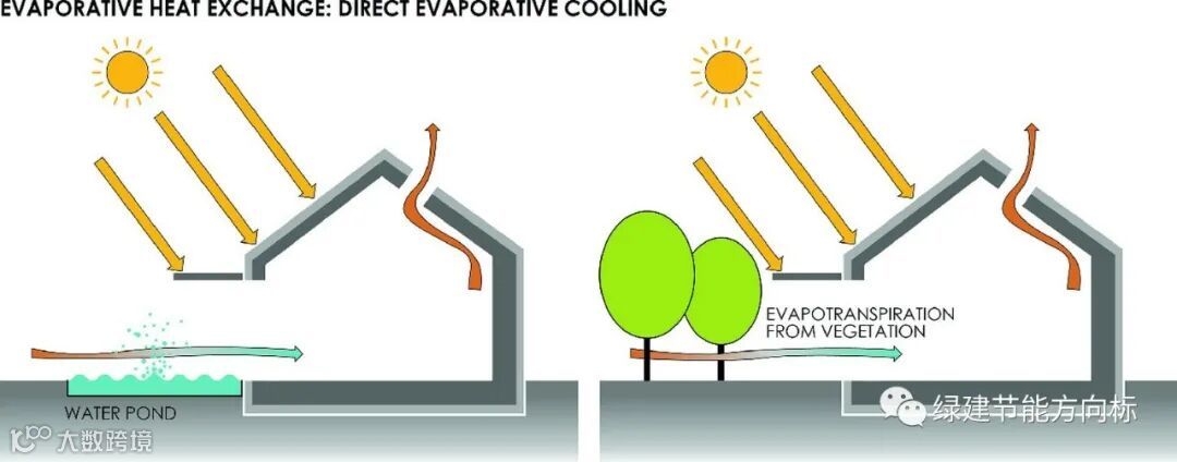 在空气非常干燥和炎热的地方采用这种冷却方法。这里的主要问题是干燥,因此为了增加相对湿度,放置了水池。水池周围的空间通过蒸发分子带走潜热而冷却,从而创造出一个舒适的空间。