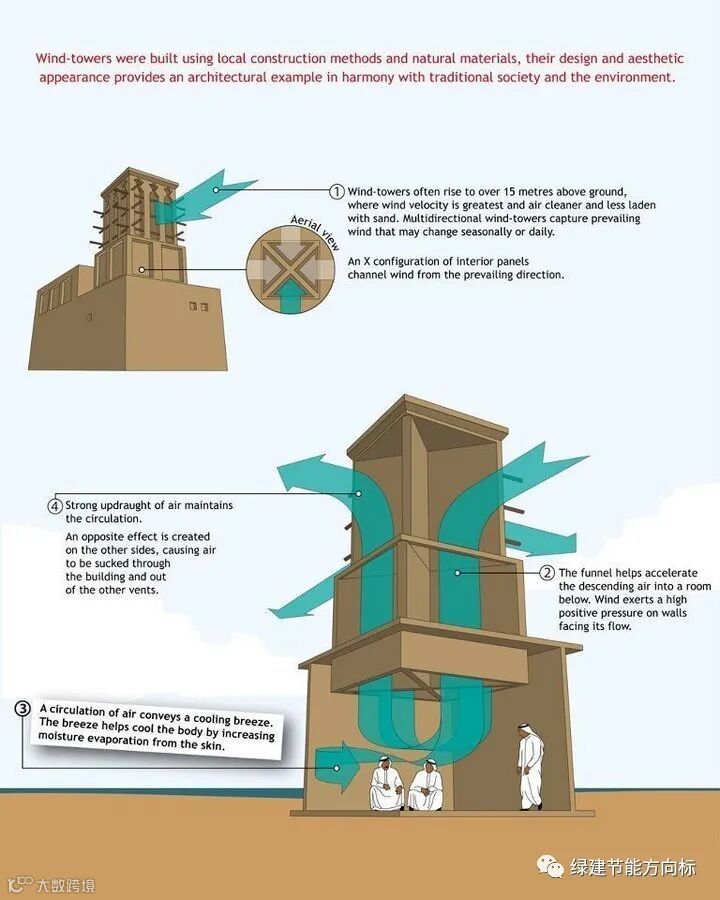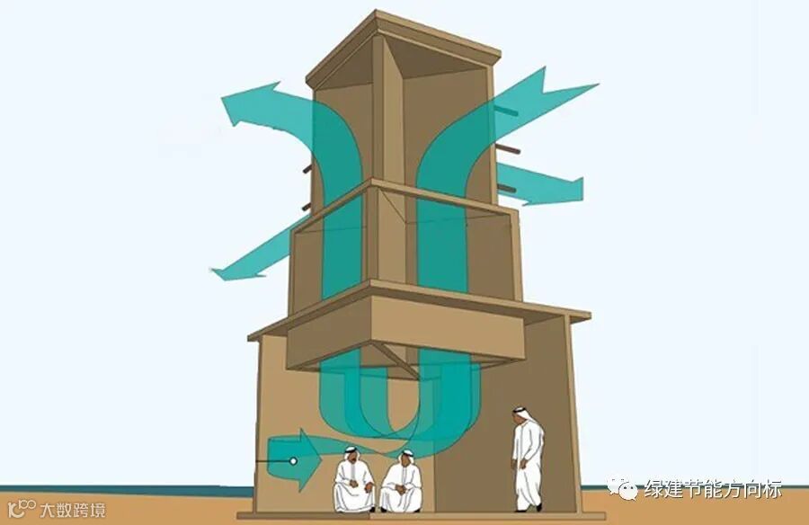 在炎热和潮湿的地区,空气自然流动是最优选的冷却方法,会建造捕风效益。这些设计不过是塔状结构,末端有开口,面向迎风。他们将风引导到建筑物中,创造空气流动和舒适的环境。隔墙的设计则考虑允许热空气离开建筑物。