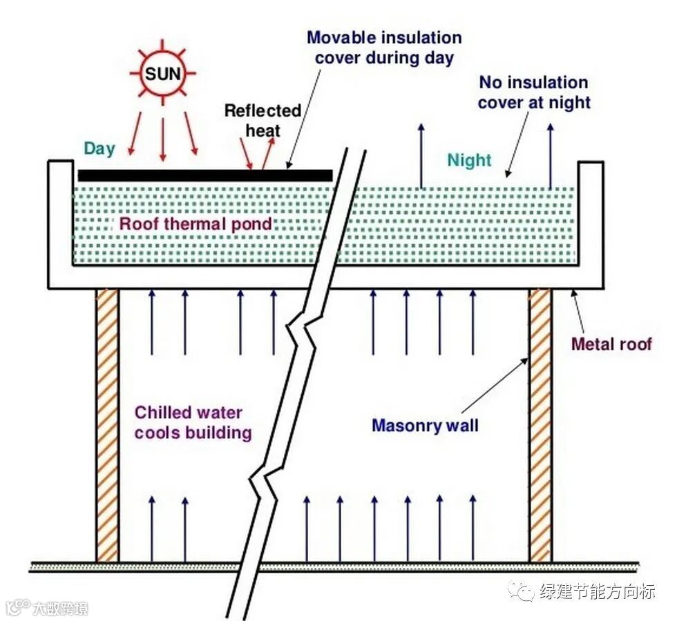 屋顶蓄水降温类似于热墙。屋顶蓄水覆盖着一个可移动的保温反射面,白天反射太阳光线并在水池充满冷水时保持屋内凉爽的温度。晚上,池塘裸露在外,自然冷却。
