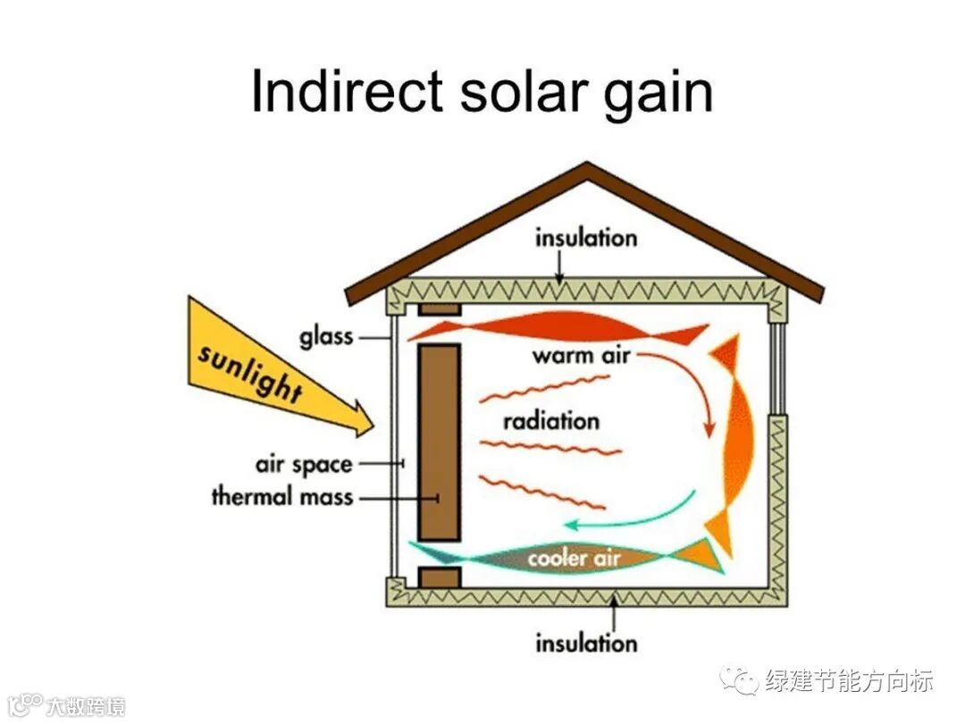 间接太阳能增益用于加热或不是生活空间的空间,而是与它们相邻的通道或空间。直射的阳光照射到外壁并加热通道,该通道充当热质量并以较小的强度加热内壁。这种设计不太受欢迎,因为它阻挡了视野和日光。 Glass Trombe 墙通常用于加热特定部分,并通过保留热量的热墙将其传递到内部。窗纱也可以作为间接的太阳能增益墙。